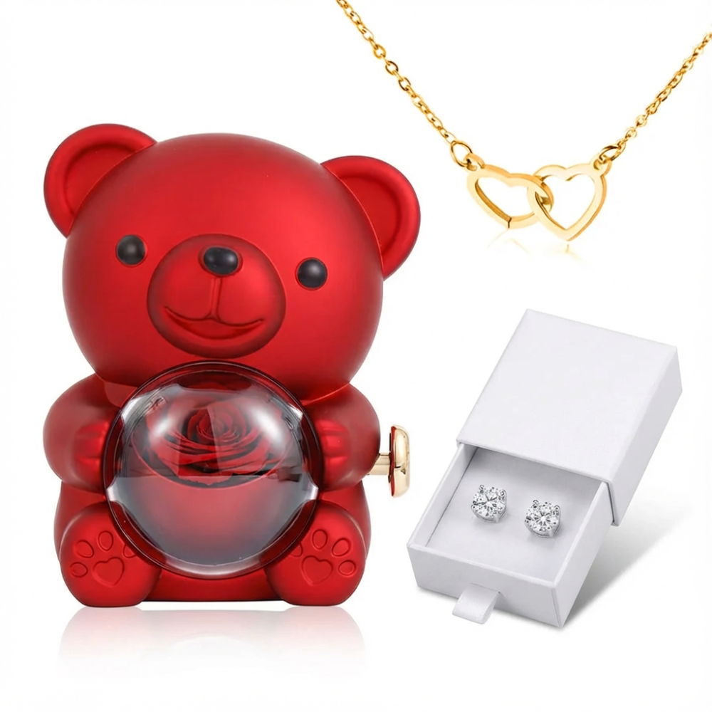 Evige Rosenbjørn Gaveeske med Inngravert Hjerte Halskjede - Gratis Øredobber